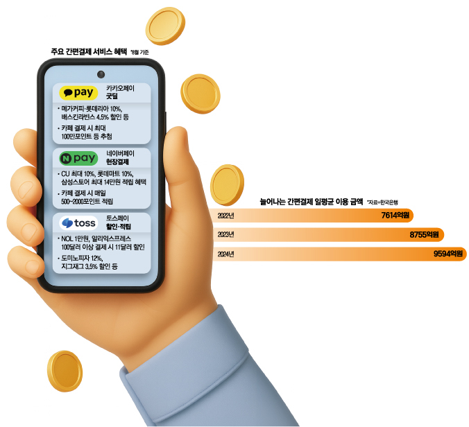 미리 은행 계좌, 신용카드 등을 등록만 해놓으면 앱을 통해 결제가 가능한 '간편결제'시장이 할인 등 각종 혜택을 내세우며 저변을 넓히고 있습니다. 온라인을 주 타깃으로 공략하던 네이버페이, 카카오페이, 토스페이 등 결제 업체들은 오프라인까지 영토를 확장하고 있는데요, ‘소확행(소소하지만 확실한 행복)’을 추구하는 20·30대 젊은 층 스타일과 잘 맞아떨어지면서 서로 ‘윈윈’하는 결과를 내고 있다는 평가를 받습니다.
