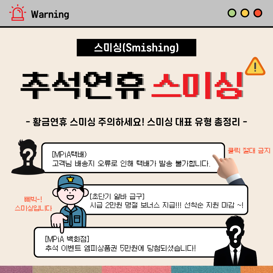 정부는 이번 추석 명절연휴 기간을 전후해 교통법규 위반에 따른 범칙금 부과, 쓰레기 무단투기 확인에 따른 과태료 부과, 명절선물 택배 배송 조회 등을 사칭하는 스미싱 메시지가 다량 유포될 수 있어 국민들의 각별한 주의를 요구했습니다. 특히 정상문자처럼 속인 후 금전이나 상품권, 금융거래 정보 등을 요구하는 메신저 피싱 피해도 증가하는 추세로, 스마트폰 문자 확인 및 SNS 사용에 세심한 주의가 필요합니다.