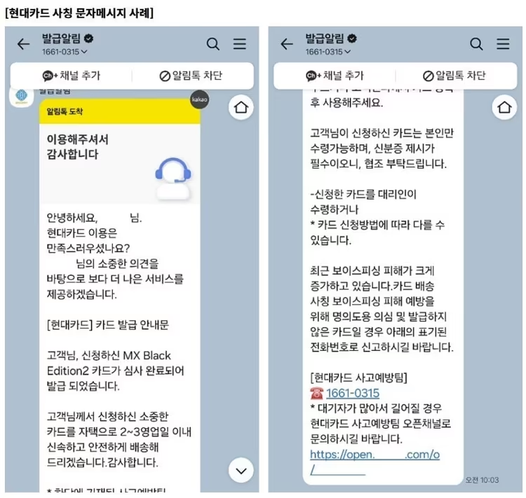 최근 신청하지 않은 카드가 발급됐다는 카카오톡 안내 메시지를 발송하며 유인해 고객 예금을 편취하는 보이스피싱 사례가 늘고 있어 주의가 요구됩니다. 카드사는 카드발급 신청·발급·배송안내·피해신고 접수 등을 이유로 원격 업무 처리 및 회원 개인정보를 요구하지 않는다고 설명했는데요, 더불어 문자 등 메시지에 포함된 출처가 불분명한 링크는 누르지 않는 것이 좋다고 당부했습니다.
